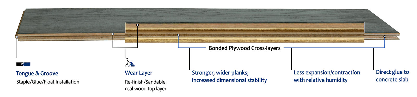 An Engineered Hardwood plank consists of different layers in which the top layer is the finished Hardwood and the base layers are Plywood or a wood substitute, such as a Pine or Birch, also known as a Solid Core VS. Ply-base. This method of Engineering results in increased dimensional stability which gives the Engineered Hardwood many benefits, some of which are: